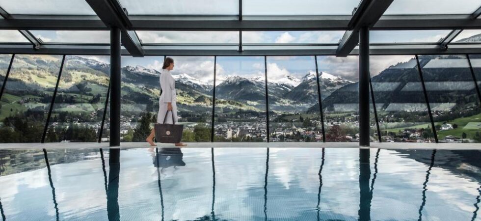 LEBENSBERG Schlosshotel ligger på en liten kulle, ca 1 km från Kitzbühels centrum, med utsikt över staden och bergen. När du anländer möts du av en historisk byggnad med moderna, varma material invändigt – trä, dämpade färger och en ljus design från en renovering 2019