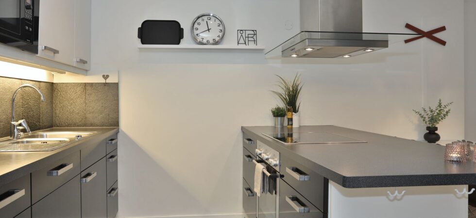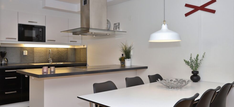 Køkkenet indeholder komfur med varmluftsovn, mikro, køleskab og fryser, opvaskemaskine.