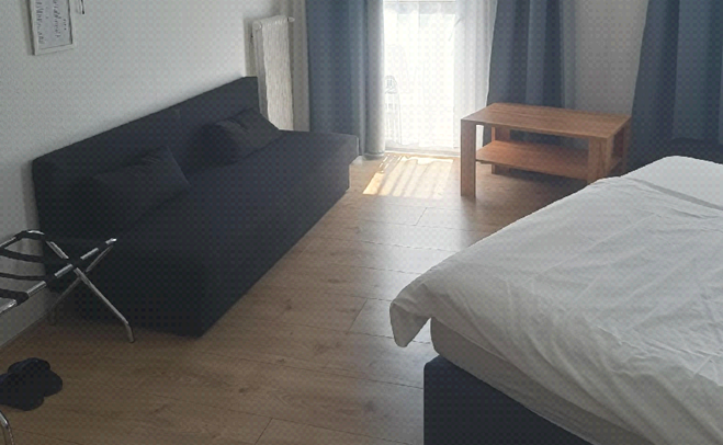 Familieværelse med balkon på ca. 19 m2 med dobbeltseng, sovesofa til 1-2 personer og tv. Badeværelse med toilet og bruser/badekar.