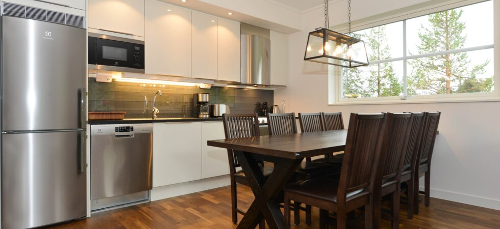 Køkkenet indeholder: keramiske kogeplader, indbygningsovn, microovn, køleskab, frys, opvaskemaskine.