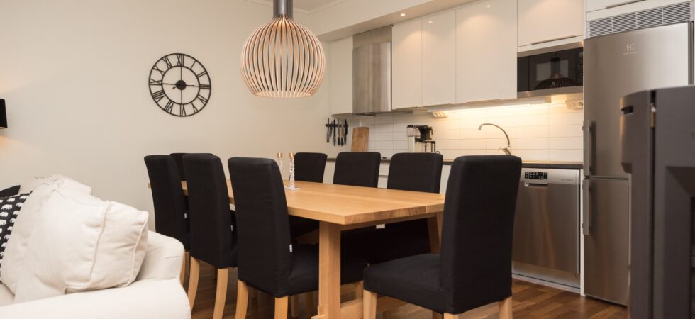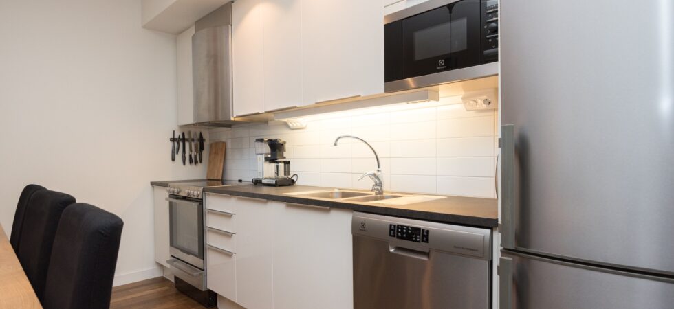 Køkkenet indeholder: keramiske kogeplader, indbygningsovn, microovn, køleskab, frys, opvaskemaskine.