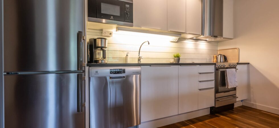 Køkkenet indeholder: keramiske kogeplader, ovn, microovn, køleskab, frys, opvaskemaskine.