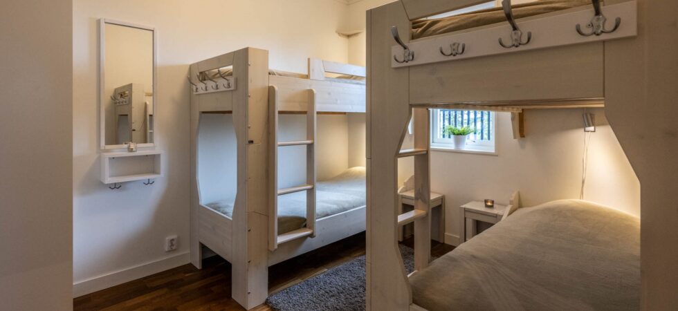 Soveværelse-1= 1 dobbeltseng 180 cm bred. Soveværelse-2= 2 køjesenge 80 cm bred. Soveværelse-3= 2 køjesenge 80 cm bred.